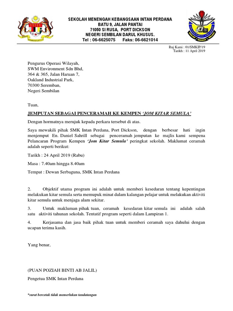 Contoh Surat Jemputan Penceramah Cikgu Azly Letter Head Ruj Kami Tarikh Pengetua Smk Manir Studocu